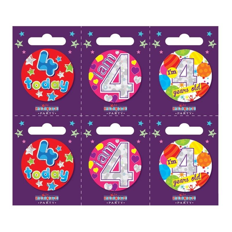 Age 4 Small Badges (6 assorted per perforated card) (5.5cm)