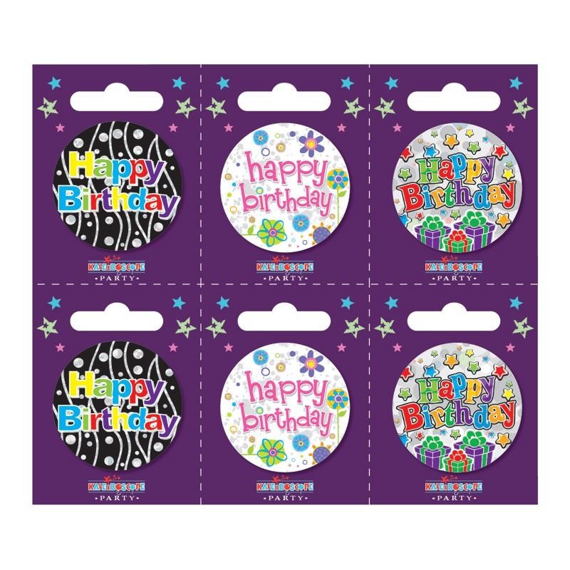 Happy Birthday Small Badges (6 assorted per perforated card) (5.5cm)