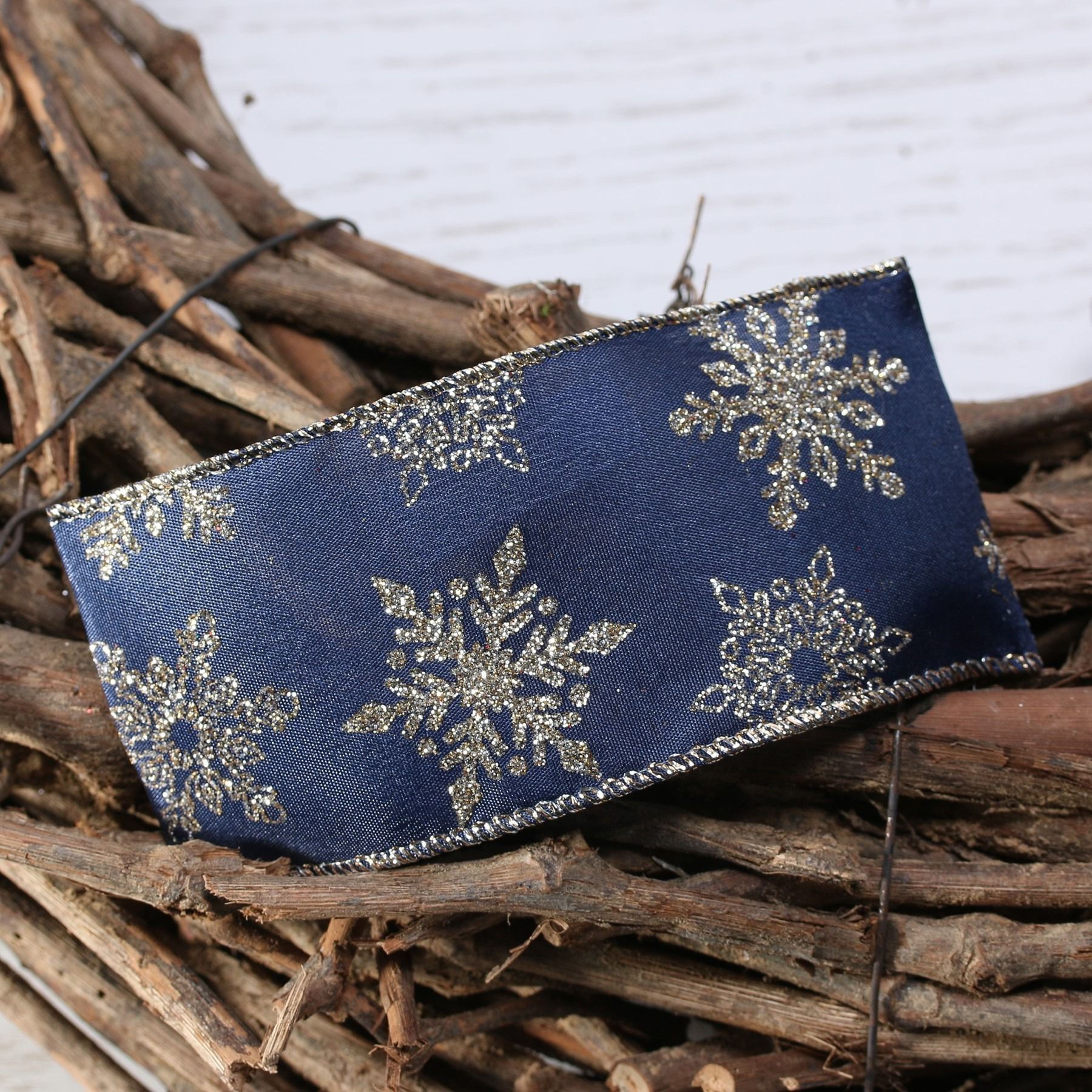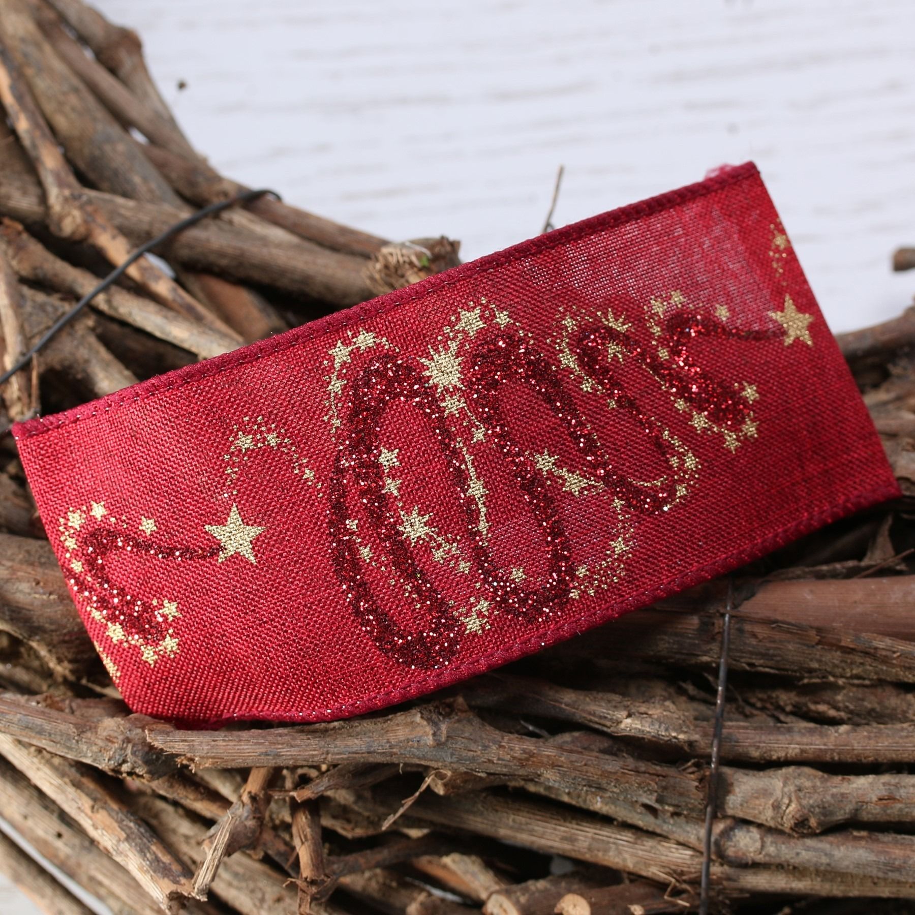 Natural burgundy with Christmas gold star / red glitter swirl w/e 63mm x 10yd