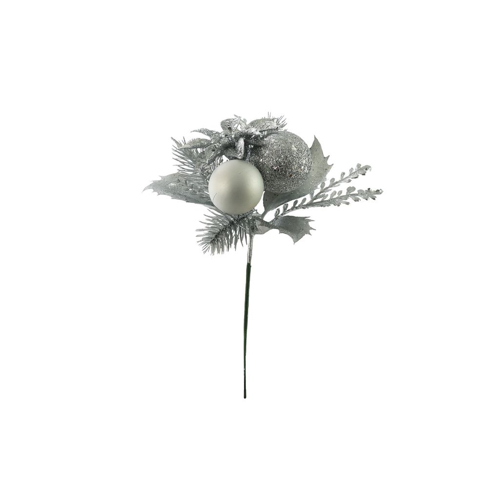 Glitter & Plain Baubles with Silver Foliage Pick - 16cm